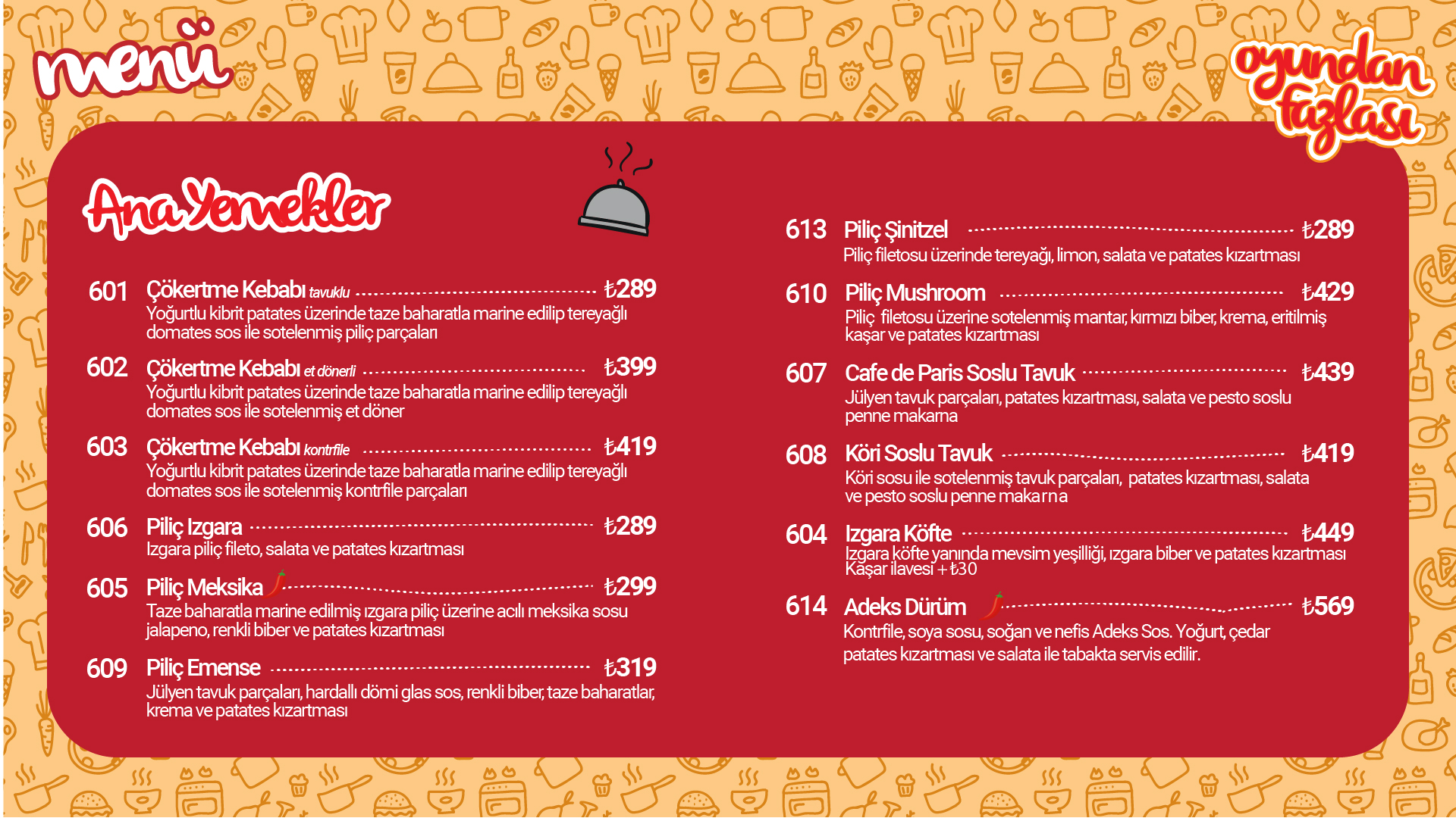 Kontrfile, soya sosu, soğan ve nefis Adeks Sos. Yoğurt, çedar patates kızartması ve salata ile tabakta servis edilir.